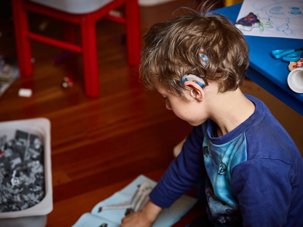 Es ist die einzige medizinische Lösung, mit der der Hörsinn wieder hergestellt werden kann. Es besteht aus dem hinter dem Ohr getragenen Audioprozessor und dem eigentlichen Cochlea-Implantat, das in einem chriurgischen Eingriff direkt unter die Haut platziert wird.