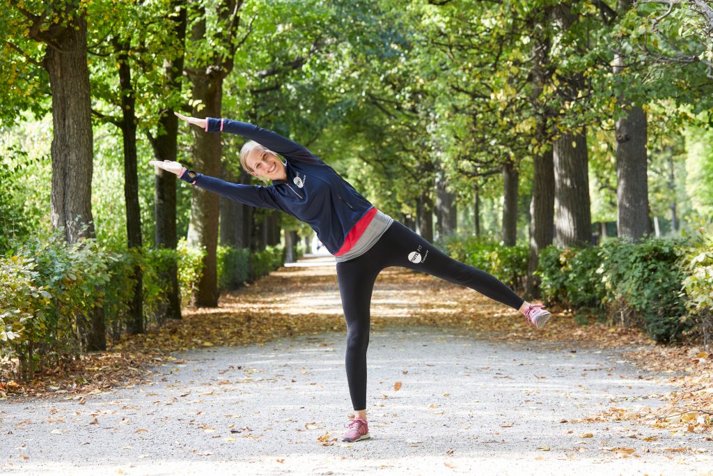 1| Ausgangsposition: Leicht nach vorne lehnen, ein Bein gestreckt nach hinten, vorderes Bein leicht abgewinkelt, Arme seitlich gespannt neben dem Oberkörper (Handfläche nach innen schauend). Pro Seite 8-12x wiederholen.