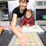 4. Teig auf einer leicht bemehlten Arbeitsfläche 4 mm dick ausrollen. Mit Keksausstechern den Teig ausstechen und diese mit Abstand zueinander auf den Backblechen verteilen.