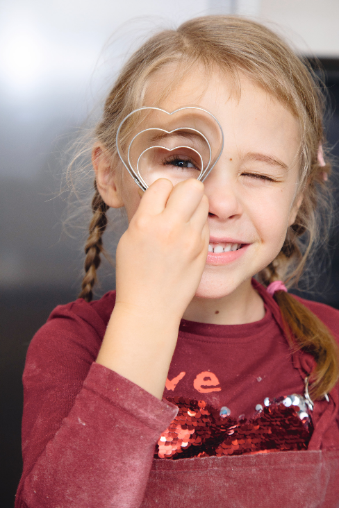 3. Teig auf einer leicht bemehlten Arbeitsfläche 4 mm dick ausrollen. Mit verschieden großen Herzausstechern eng Herzen ausstechen und diese mit Abstand zueinander auf den Backblechen verteilen. Die Hälfte der Herzen mittig mit einem kleineren Herzausstecher ausstechen.