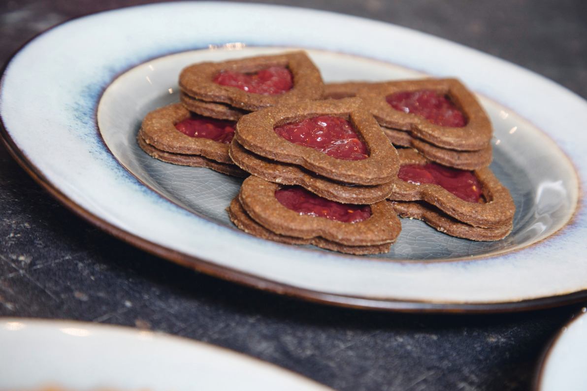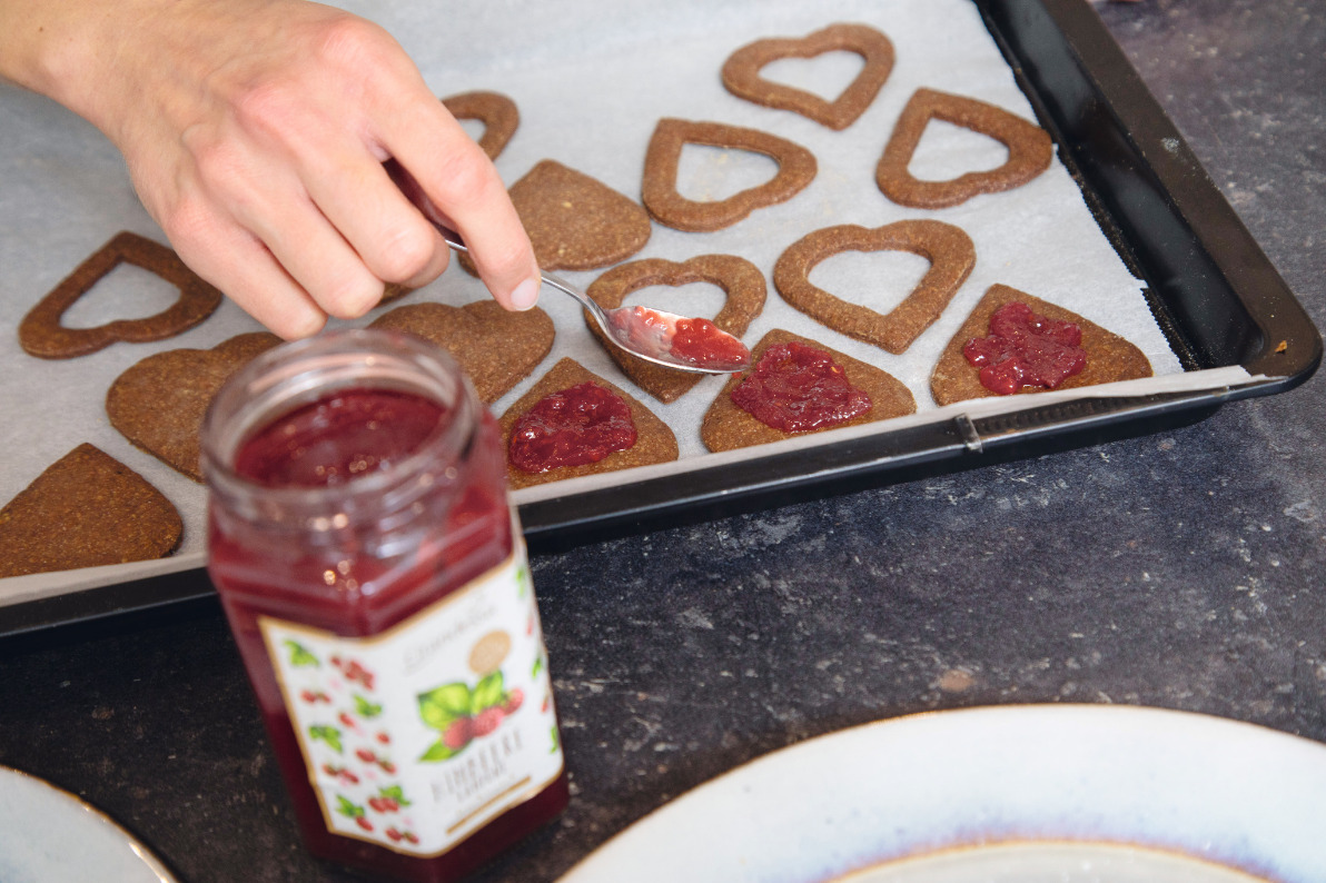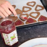 5. Marmelade durchrühren und je zwei Kekse mit etwas Marmelade zusammensetzen.