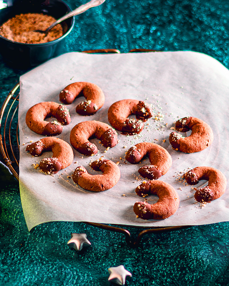 6. Die Kipferlspitzen ca. 1 cm tief in die Noisetteschokolade tauchen und auf einem Backpapierbogen ablegen. Mit geriebenen Nüssen bestreuen und anschließend im Kühlschrank vollständig aushärten lassen.