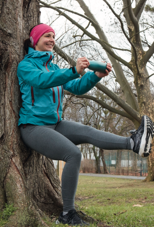 Ausführung: Mache es dir an einer Wand „gemütlich“ und „setze“ dich so hoch, wie du kannst und möchtest. Vor dem Körper hältst du mit beiden Händen eine Flasche. Mit der Ausatmung streckst du die Arme nach vorne und ziehst dabei dein Schambein in Richtung Bauchnabel, der untere Rücken drückt fest gegen die Wand. Nun hebst du ein Bein und streckst es kontrolliert aus. Mit der Einatmung setzt du das Bein wieder auf dem Bo- den ab. Nun folgt ein Beinwechsel.