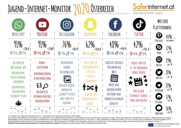 Die mit Abstand beliebtesten Internetplattformen von österreichischen Jugendlichen sind WhatsApp (91 Prozent nutzen die Plattform), YouTube (91 Prozent) und Instagram (76 Prozent). Alle drei Netzwerke konnten im Vergleich zum Vorjahr bei der Nutzung zulegen. Auf Platz vier folgt die Foto-Sharing-App Snapchat (62 Prozent). Das größte Soziale Netzwerk der Welt, Facebook, rangiert in dieser Altersgruppe wie letztes Jahr auf dem fünften Platz (48 Prozent).