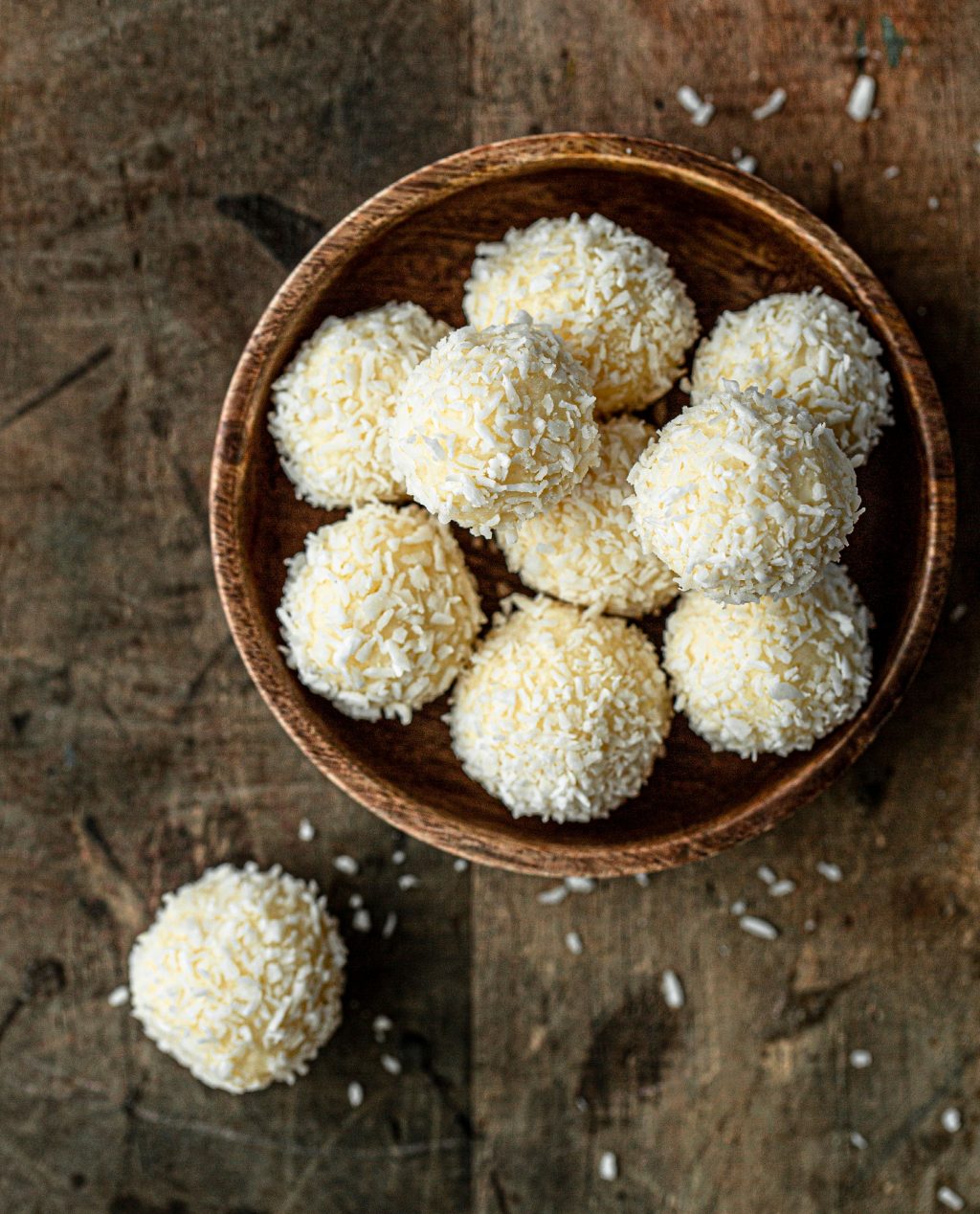 Die Schokolade über einem Wasserbad schmelzen. Puderzucker und Butter gut vermischen, anschließend die geschmolzene Schokolade unterheben. Zum Schluss die Masse mit den Kokosflocken vermengen. Anschließend für ca. 60 Minuten kalt stellen. Danach aus der Masse Kugeln formen und diese in den Kokosflocken wälzen.