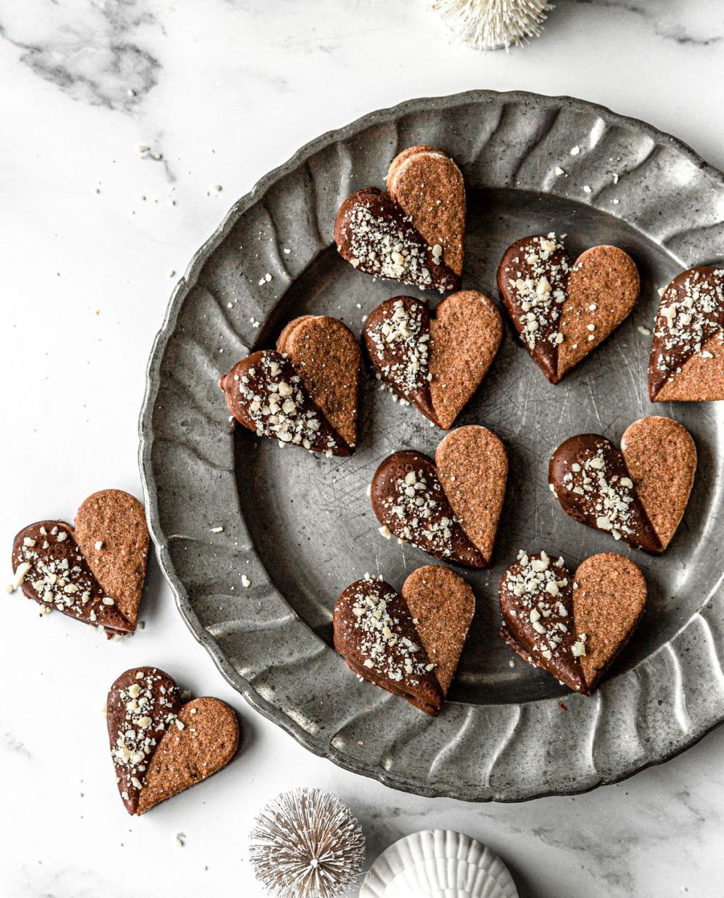 Aus den angegebenen Zutaten einen Mürbteig zubereiten und diesen in Frischhaltefolie gewickelt ca. 1 Stunde kalt stellen. Den Teig auf einer bemehlten Arbeitsfläche ca. 3–4 mm dick ausrollen, Herzen ausstechen und auf ein mit Backpapier belegtes Backblech legen. Anschließend im vorgeheizten Backofen ca. 12 Minuten lang backen. Die Herzen auskühlen lassen. Danach den Boden mit Nougatcreme bestreichen und die Deckel daraufsetzen. Den Nougat über einem Wasserbad schmelzen, die Herzen zur Hälfte tauchen und anschließend mit gehackten Nüssen bestreuen.