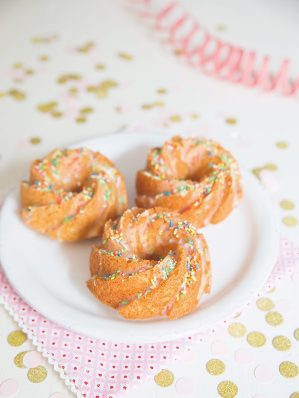 - Für den Zuckerguss den Saft der Zitrone auspressen. Den Zitronensaft mit 4 EL kaltem Wasser und Puderzucker zu einer zähen, klebrigen Masse verrühren. Die Mini-Gugel damit bestreichen und mit bunten Streuseln bestreuen.