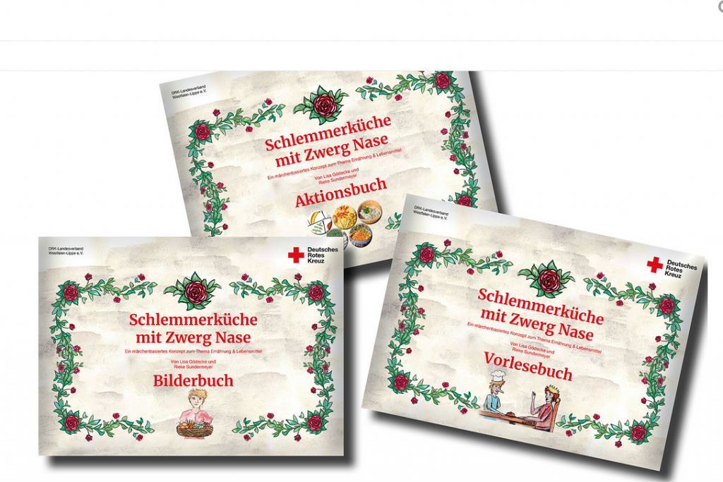 „Schlemmerküche mit Zwerg Nase“ besteht aus einem Vorlesebuch, einem Bilderbuch und einem Aktionsbuch. Es richtet sich an Erzieher*innen und Eltern von Kindern im Alter von drei bis sechs Jahren oder auch älter. Die Geschichte ist an Wilhelm Hauffs Märchen „Der Zwerg Nase“ angelehnt. Der DRK-Landesverband Westfalen-Lippe wird die Hefte in rund 300 DRK-Kindergärten in seinem Einzugsgebiet zur Verfügung stellen. Unter www.fh.ms/schlemmerkueche sind sie kostenfrei für alle herunterzuladen.