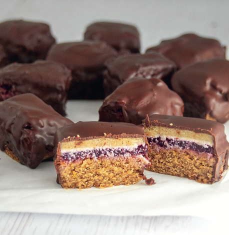 Nimm den Boden und das Gelee aus dem Kühlschrank und hebe es am Backpapier aus der Form. Lege die Marzipanmasse über das Gelee, drücke sie leicht an und schneide die überstehenden Ränder ab. Schmelze die Schokolade im Wasserbad. Schneide den „Kuchen“ mit einem scharfen Messer vorsichtig in viele kleine Dominosteine, tunke sie nach und nach in die Schokolade, lass sie kurz abtropfen und setze sie auf einen Teller mit Backpapier oder ein Kuchengitter. Stell sie dann nochmal für eine Stunde in den Kühlschrank. Bewahre sie auch weiterhin im Kühlschrank auf.