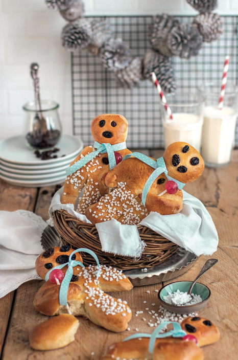 Hefe mit 1 Prise Zucker in 3 EL lauwarmem Wasser auflösen. Mehl in eine große Schüssel geben, eine Mulde formen, die Hefe hineingeben, mit etwas Mehl bestauben und abgedeckt 10–15 Minuten gehen lassen. Restlichen Zucker, Vanillezucker, 1/2 TL Salz, Eier und lauwarme Milch hinzugeben und grob verkneten. Die Butter dazugeben und zu einem geschmeidigen Hefeteig weiterkneten. Mit Frischhaltefolie abgedeckt an einem warmen Ort 90 Minuten gehen lassen. Ein Backblech mit Backpapier oder Dauerbackfolie auslegen. Den Teig in ca. 200 g schwere Portionen teilen und zu Kugeln formen. Die Teigkugeln locker abdecken und 5–8 Minuten ruhen lassen. Anschließend die Kugeln jeweils auf eine Länge von ca. 18–20cm oval ausrollen. Nun den Teig mit dem Messer oder einer Schere von der Unterseite mittig einschneiden und die Teigstücke leicht auseinanderziehen. Für den Kopf an der oberen Seite auf beiden Seiten den Teig schräg nach oben einschneiden. Nun seitlich noch die Arme nach oben einschneiden und leicht vom Körper lösen. Die kleinen Männchen, locker abgedeckt, nochmals 15 Minuten gehen lassen. Eigelb mit Milch verrühren, die Männchen damit dünn bestreichen und nach Belieben mit Rosinen und Hagelzucker dekorieren.