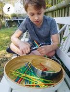 Keine Sorge, die Plastiktrinkhalme hatte Julius noch im Keller gefunden. Du kannst auch ökologisch abbaubare Alternativen aus Papier, Stroh, Weizen oder Bambus nehmen. Wenn das Material zu hart für die Schere ist, verwendest du eine feine Säge.