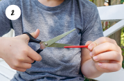 Nun der Länge nach die Halme aufschneiden. Dabei mit der Schere an der Öffnung ansetzen, schrittweise schneiden, und am Ende umgreifen, damit du dir nicht in den Finger schneidest.