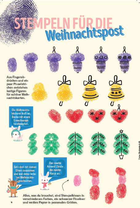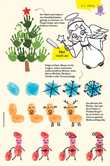 Aus Fingerabdrücken und ein paar Pinselstrichen entstehen lustige Figuren für schöne Weihnachtskarten.