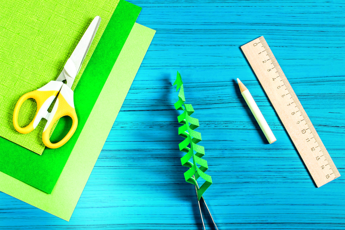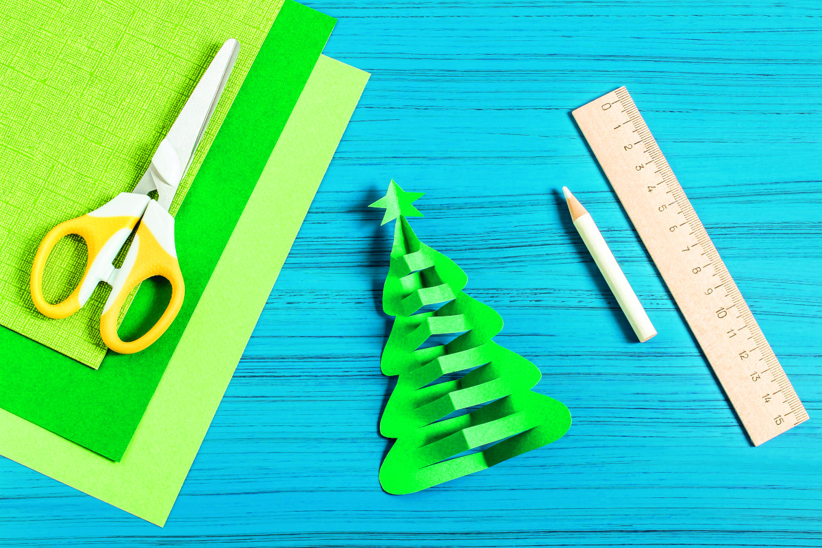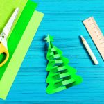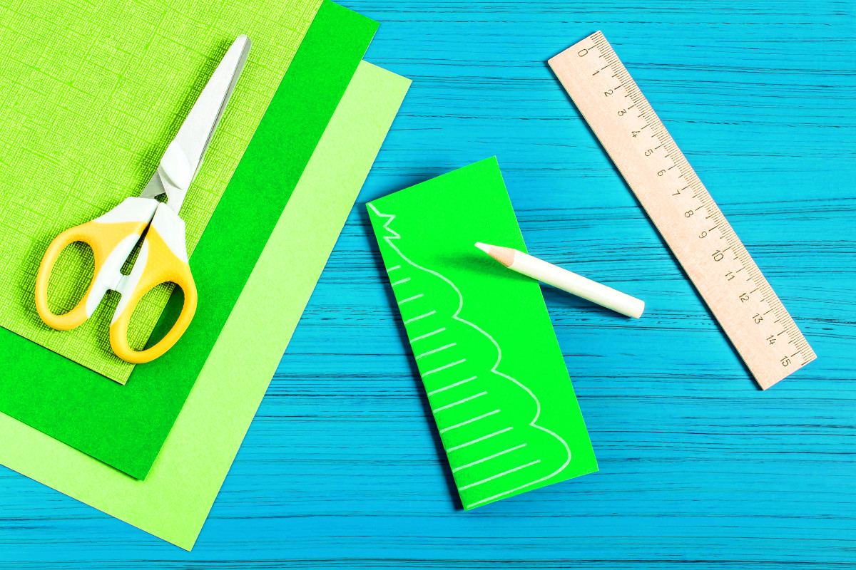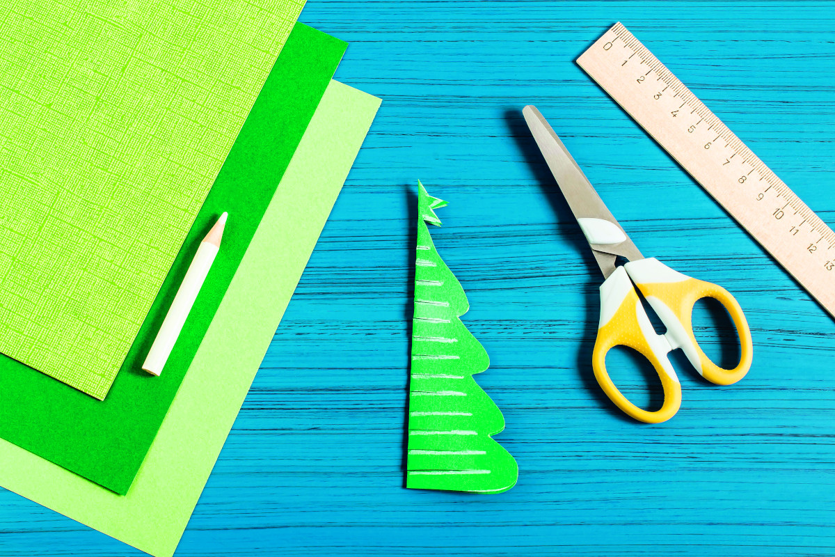 1. Schneide einen Karton in jener Größe zu, die der Weihnachtsbaum haben soll. Falte ihn in der Hälfte.