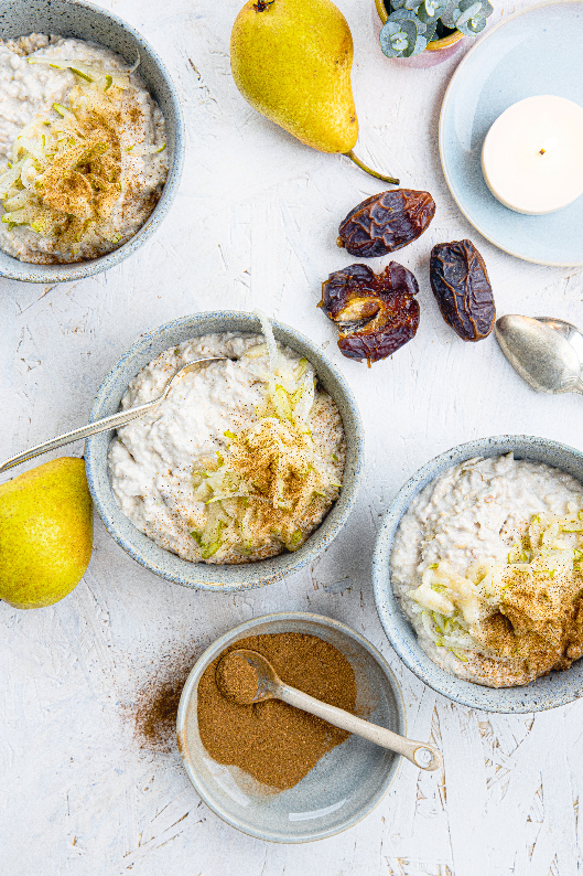 2 Je die Hälfte der Bananen und Birnen sowie die Datteln in einer großen Schüssel mit den Getreideflocken, Joghurt und Nussmus verrühren und mit Zimt und Vanille würzen.