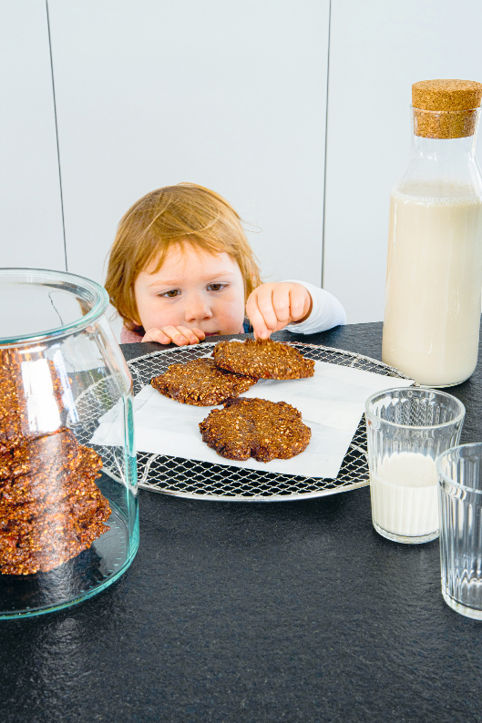 Tipps: Im Sommer friere ich die Kekse zwischen zwei Lagen Backpapier ein. Eine besonders knusprig-kalte Überraschung an heißen Tagen. Für ein Eis-Keks-Sandwich Eis zwischen zwei Kekse streichen. Hat man es sehr eilig, lässt man die Süßkartoffel einfach weg. Ohne Gemüse sind die Kekse nach dem Backen noch knuspriger.