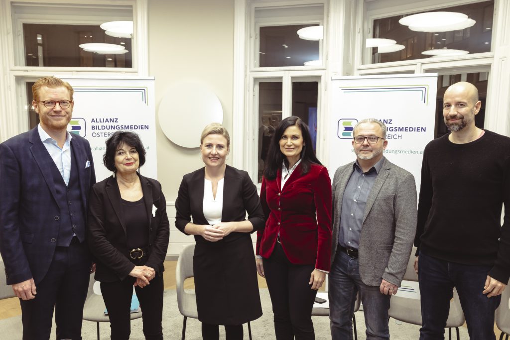 v.l.n.r.: Maximilian Schulyok (Vorstandsmitglied der Allianz Bildungsmedien Österreich), Bildungspsychologin emer. Univ.-Prof. Dr.Dr. Christiane Spiel, Familienministerin Dr. Susanne Raab, Silvia-Grünberger, Karl-Dwulit (Vorsitzender Landesverband der Elternvereine an Pflichtschulen in Wien) und Univ.-Prof. Fares Kayali.