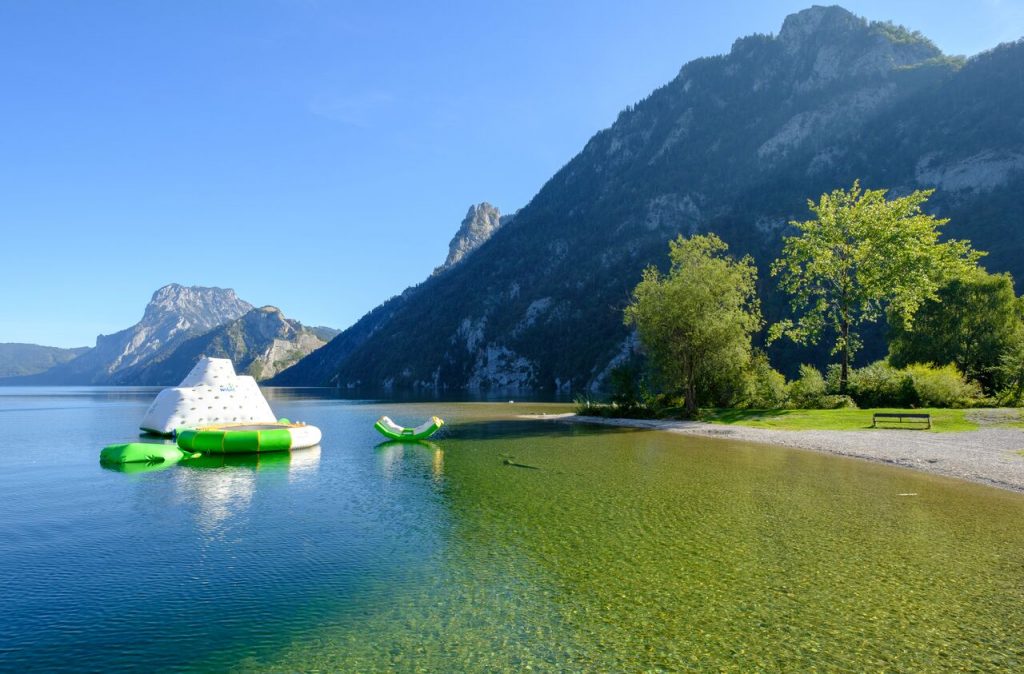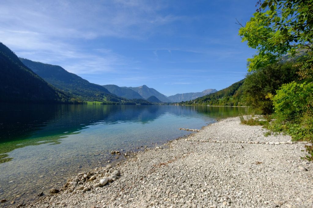 Steirisches Salzkammergut. Der flache Schotterstrand ist bei Familien beliebt.