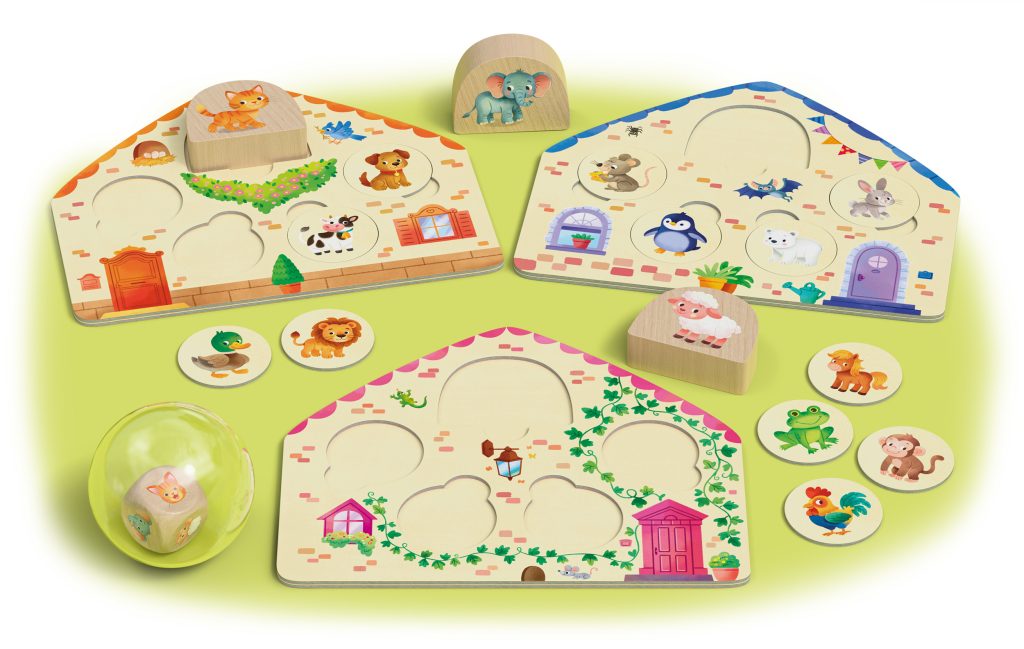 Der Würfel mit seinen liebevoll gestalteten Tiermotiven steckt sicher in einem weichen Gummiball und kann fröhlich durch den ganzen Raum gerollt werden. So werden die Tiere „erwürfelt“, die anschließend in den drei abwechslungsreichen Spielen der Sammlung zum Einsatz kommen – jedes davon mit einem eigenen Fokus auf wichtige Entwicklungsschritte.