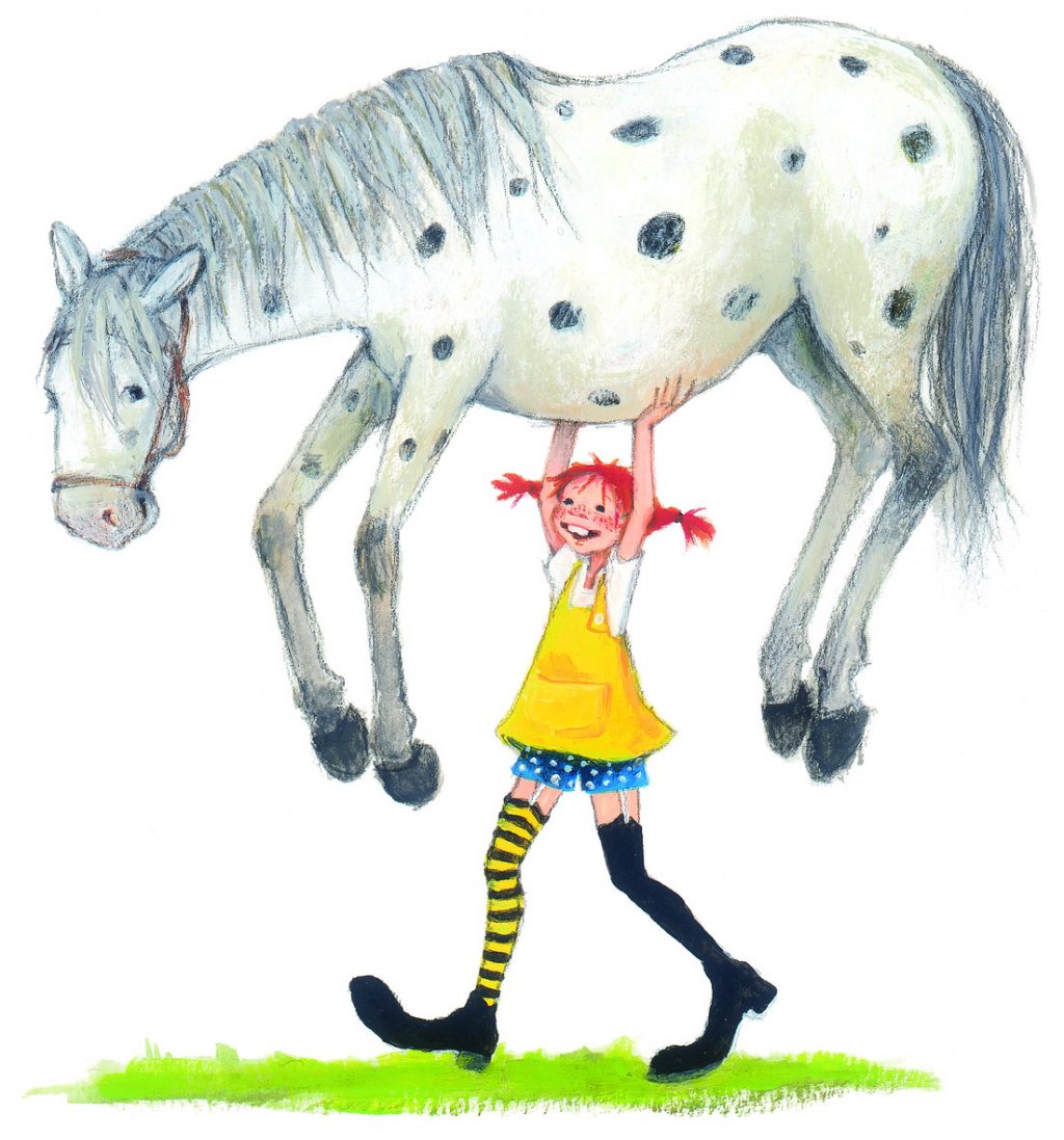 Das Gesicht übersäht mit Sommersprossen, karottenrote Zöpfe, übergroße Schuhe und verschiedenfarbige Strümpfe. Rein äußerlich entspricht sie so gar nicht dem gängigen Mädchen-Ideal. Eine Außenseiterin ist Pippilotta Viktualia Rollgardina Pfefferminz Efraimstochter Langstrumpf deshalb aber noch lange nicht. Pippi strotzt nur so von Selbstbewusstsein, schließlich ist sie das stärkste Mädchen der ganzen Welt. Mit ihren neun Jahren nimmt sie es locker mit dem berüchtigten Schwergewicht August auf, bezwingt die beiden Ganoven Blom und Donner-Karlsson und stemmt ihr eigenes Pferd mit Leichtigkeit in die Luft. Obwohl sie in der Villa Kunterbunt ohne Eltern lebt, führt Pippi ein selbstständiges und angstbefreites Leben. So eigenwillig wie ihr Umfeld ist auch ihr Charakter. Pippi ist frech, mutig, großzügig, hilft Schwächeren und hinterfragt Dinge kritisch, die als gegeben gelten.