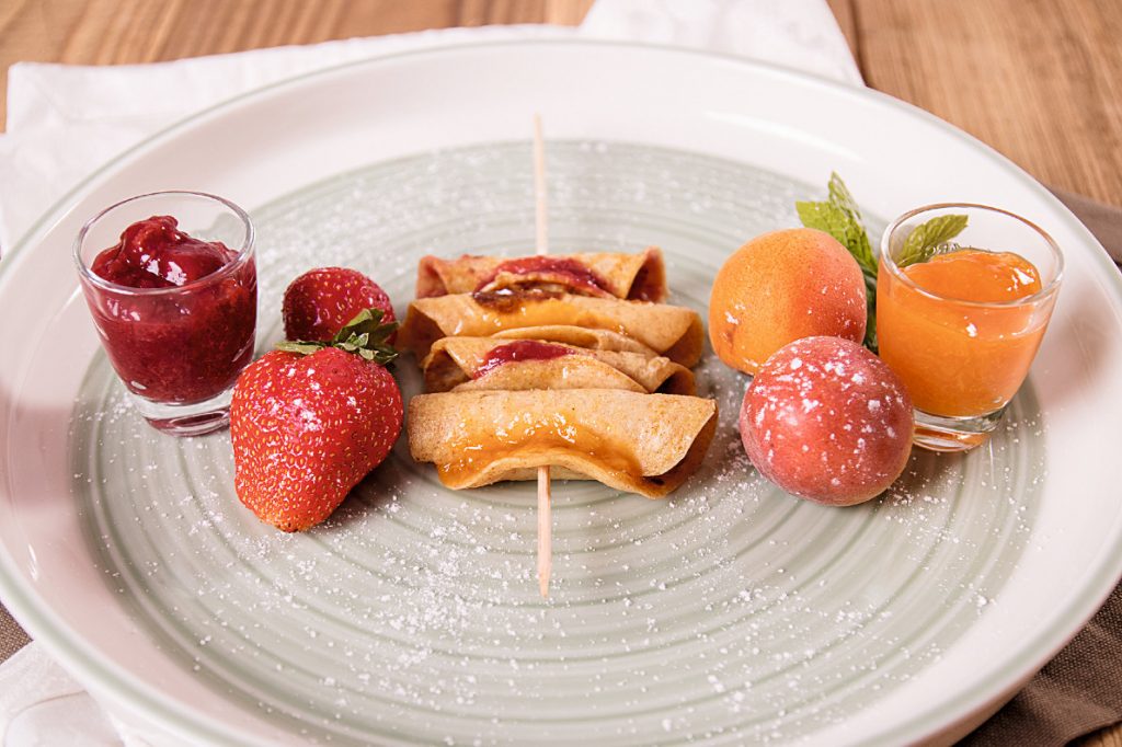 Tipp: Besonders gut schmeckt der Mini-Palatschinkenspieß, wenn du auch frisches Obst, etwa Erdbeeren oder Bananenstücke zwischen die einzelnen Palatschinken aufspießt.