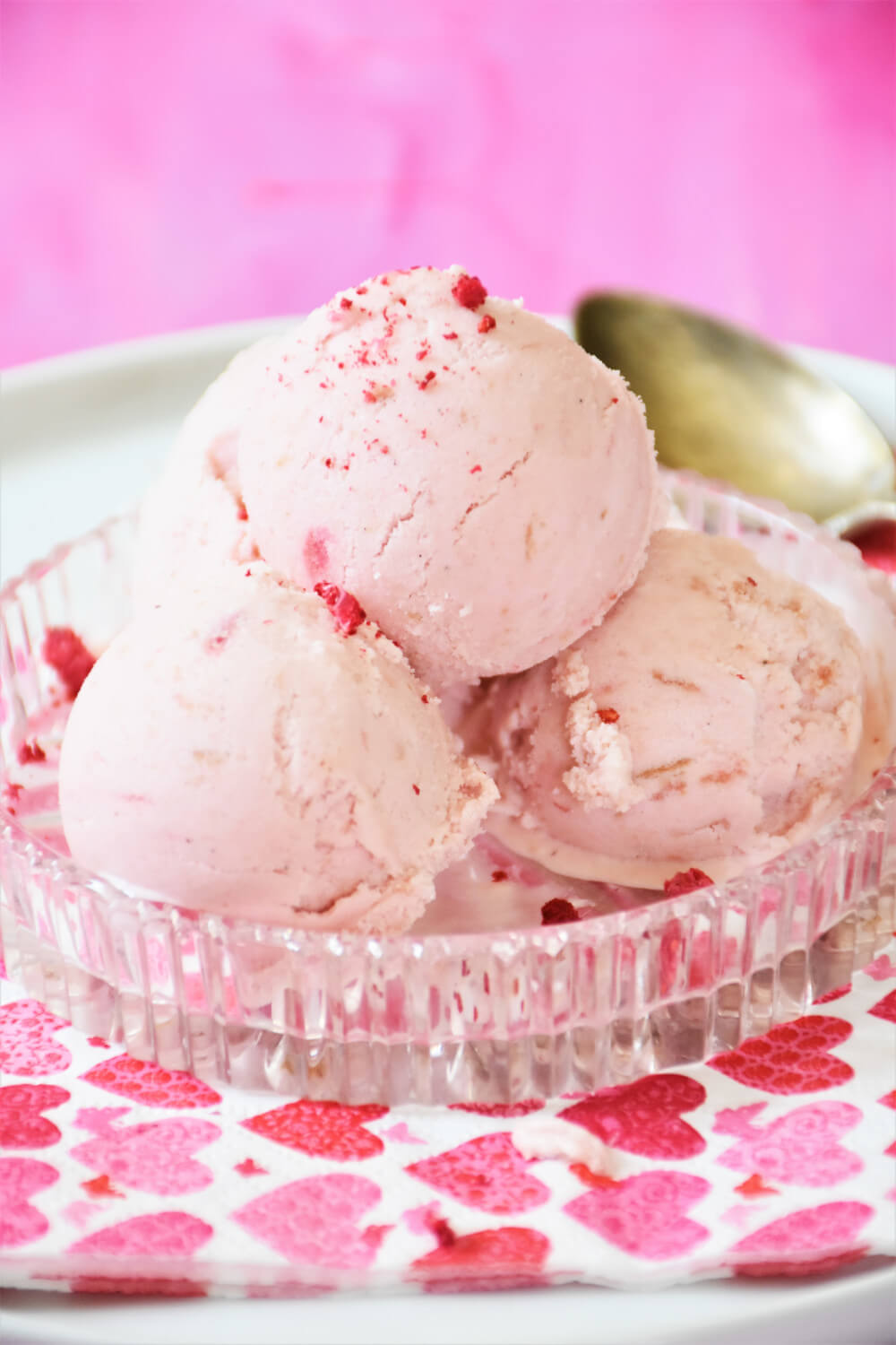 - Ich habe die Stückchen Rhabarber ganz lassen und das Eis mit ein paar wenigen gefriergetrockneten Himbeerestückchen garniert.