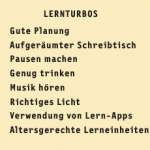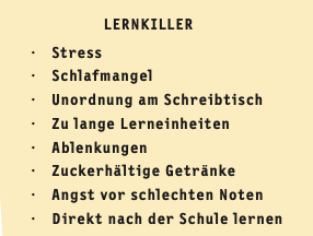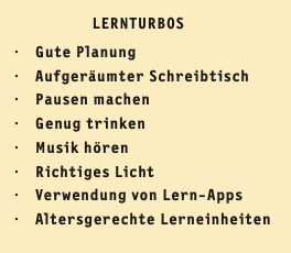 Lernen fällt nicht immer leicht, denn einige Dinge haben positiven oder negativen Einfluss auf den Lernenden. Das Gute daran: Wir können diese Dinge selbst beeinflussen. Eine angepasste, angenehme Lernumgebung spielt eine positive Rolle beim Lernen, eine Umgebung, in der wir uns nicht wohlfühlen, eine negative. Stim- men die Bedingungen, können wir uns viel einfacher und fokussierter auf den Lernstoff konzentrieren. Es gibt Lernsituationen, die den Lernerfolg fördern, also Lernturbos, und Lernsituationen, die den Lernerfolg behindern, also Lernkiller.