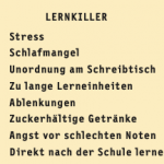 Es ist jedoch nicht nur wichtig, wo man lernt, sondern auch wann und wie lange. Kommt das Kind gerade aus der Schule, hat es sich eine Pause verdient. Direkt nach der Schule zu lernen, hat wenig Sinn, da das Kind erschöpft ist und den Lernstoff nicht aufnehmen kann. Auch stundenlanges Lernen ohne Pause ist ein Lernkiller. Um Lernerfolge zu erzielen, ist es wichtig, den Stoff in kleinere Lerneinheiten aufzuteilen. Volksschulkinder können sich oft nur 10 oder 20 Minuten am Schreibtisch sitzend konzentrieren, bei älteren Schülern sind auch 45 Minuten möglich. Nach jeder Lerneinheit sollte eine Pause gemacht werden, in der das Kind vom Schreibtisch aufsteht, sich etwas bewegen kann und etwas trinkt oder isst, denn mit Hunger und Durst kann man sich ebenfalls nicht konzentrieren. Für eine gute Lernleistung ist ein ausgeglichener Blutglukose-Spiegel wichtig. Wenn Wasser oder Nährstoffe fehlen, ist man unaufmerksam, langsamer und macht mehr Fehler.