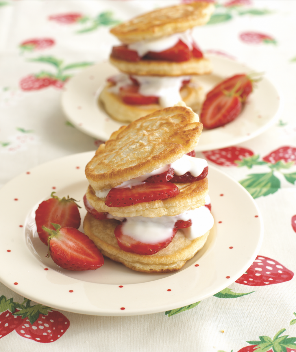Serviere deine Palatschinken mit Erdbeerscheiben und Naturjoghurt!