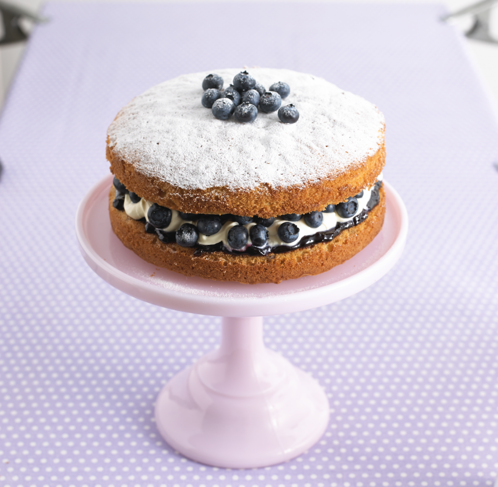 Nun kannst du die Torte füllen. Schlage dafür das Schlagobers in einer Schüssel steif. Bestreiche die flache Seite eines Teigbodens mit Heidelbeermarmelade. Gib darauf das Schlagobers und die Heidelbeeren. Lege den zweiten Teigboden darauf und verziere ihn mit Puderzucker und den restlichen Beeren.