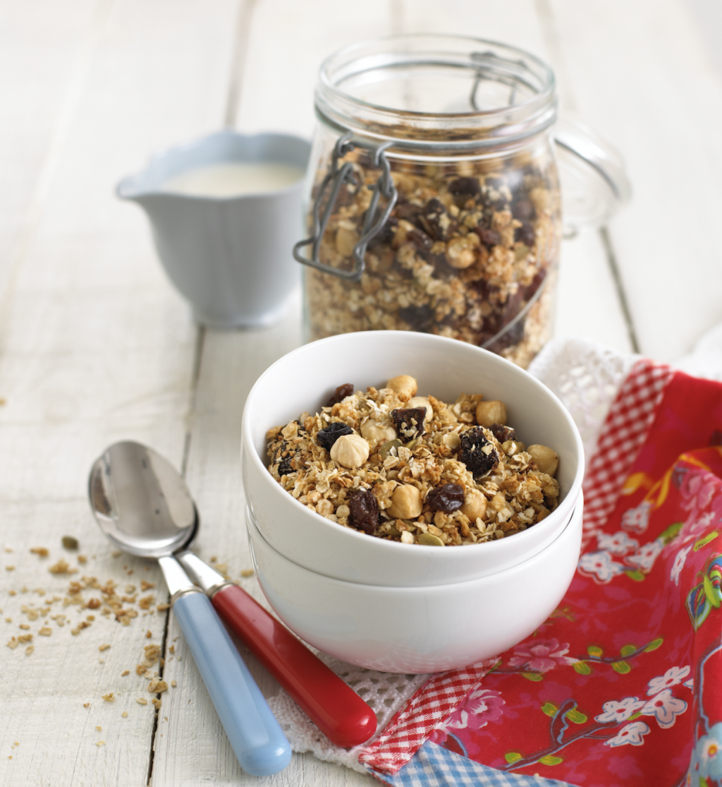 Serviere dein Müsli in einem Schüsselchen mit Milch oder einem Klecks Naturjoghurt!
