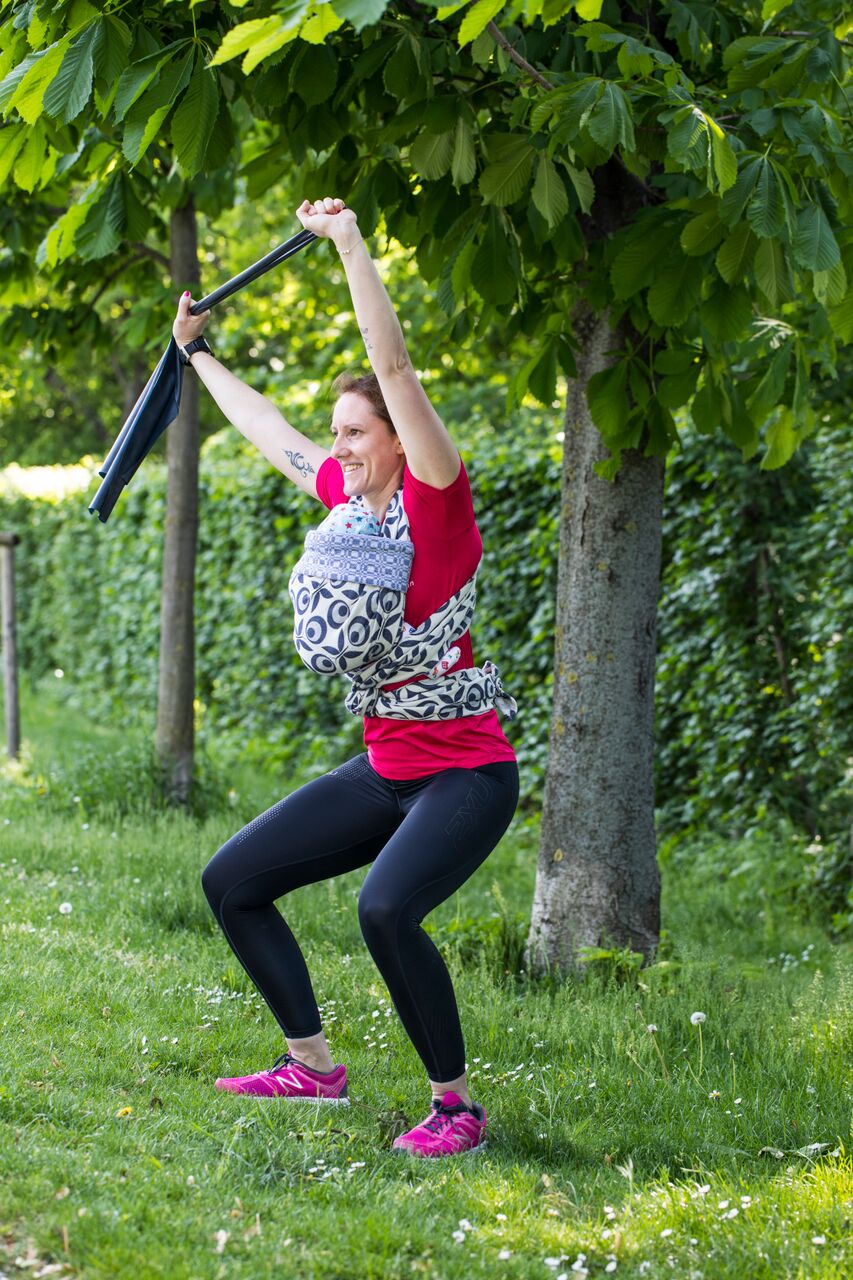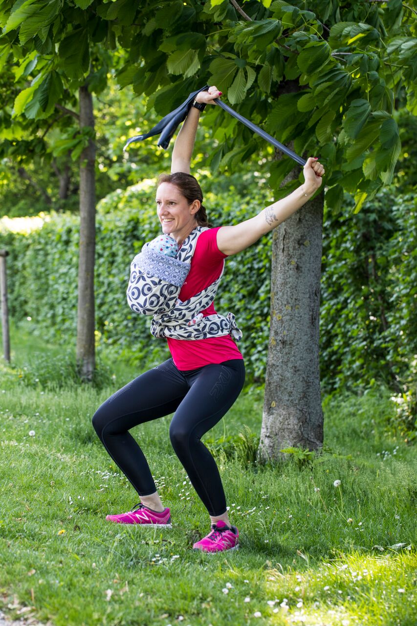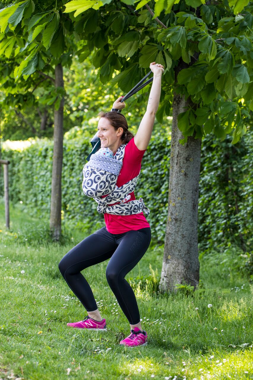 Speziell nach der Schwangerschaft bietet sich ein Training mit dem Baby in der Tragehilfe an – das fördert die Bindung zum Kind und auch die Rückbildung von Mamas Körper nach der Schwangerschaft.