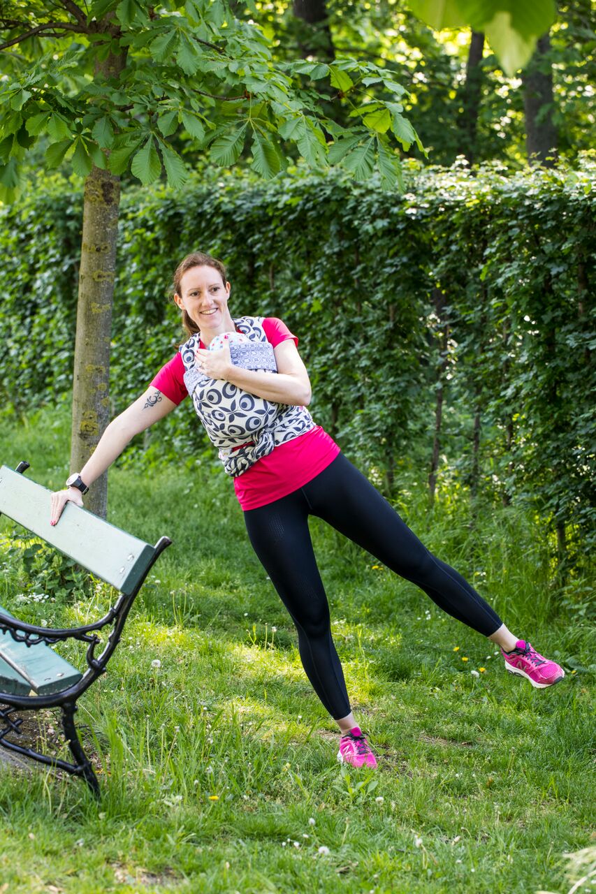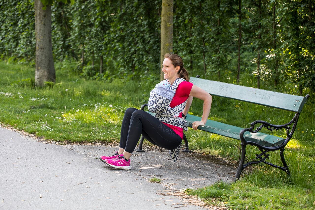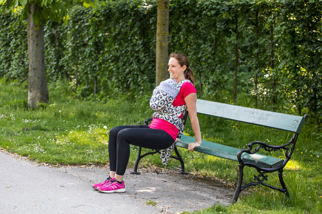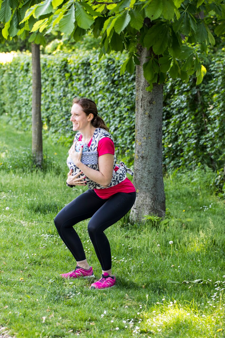 Speziell nach der Schwangerschaft bietet sich ein Training mit dem Baby in der Tragehilfe an – das fördert die Bindung zum Kind und auch die Rückbildung von Mamas Körper nach der Schwangerschaft.