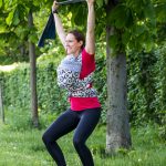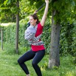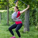 AUSFÜHRUNG: Ich bau gerne Mobilityübungen für die Schulter und den Rücken ein. Ausgangsposition ist eine leichte Kniebeuge, so wird die Hüfte stabilisiert. Die Arme gestreckt über den Kopf halten. Ein Theraband oder eine Stoffwindel halten und auseinanderziehen. Mit kleinen Kreisbewegungen über dem Kopf starten. Dabei bewegen sich nur die Arme. Die Kreise langsam vergrößern, bis sich oberer Rücken und Schultern mitbewegen. Die Hüfte bleibt weiterhin stabil. In etwa eine Minute kreisen pro Richtung, gerne auch länger.