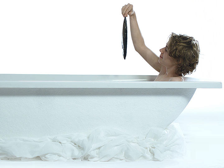 Ein Setting, für das ein Engel hätte Pate stehen können: Eine leere Badewanne auf weißem Hintergrund, darin ein Jüngling mit blonden Locken, der genüsslich in einen Apfel beißt. Im Hintergrund ertönen leise die Saiten einer Harfe. Doch die engelsgleiche Fassade beginnt zu bröckeln, digitale Fragmente verzerren das Bild und krachende Töne durchbohren die sanften Klänge.