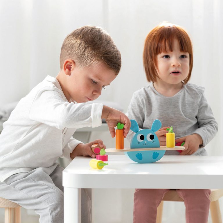 Wer schafft es das kleine, blaue Häschen in Balance zu halten? Entzückender Spiel-Spaß für Kleinkinder.