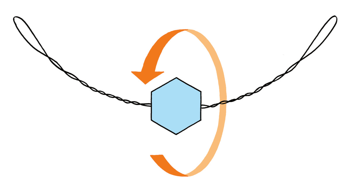 So verdrehst du die Schnur: Halte die Schlaufen waagerecht und „schleudere“ dann das Bild um die Schnur herum, bis diese sich schön aufgedreht hat. Dann hältst du das Bild fest, damit sich die Schnur nicht zu früh abdreht – einfach leicht einen Finger dagegen halten. Halte die Schnur nun senkrecht und ziehe die Schlaufen mit einem leichten Ruck stramm: Das Bild in der Mitte dreht sich jetzt schnell um die eigene Achse.