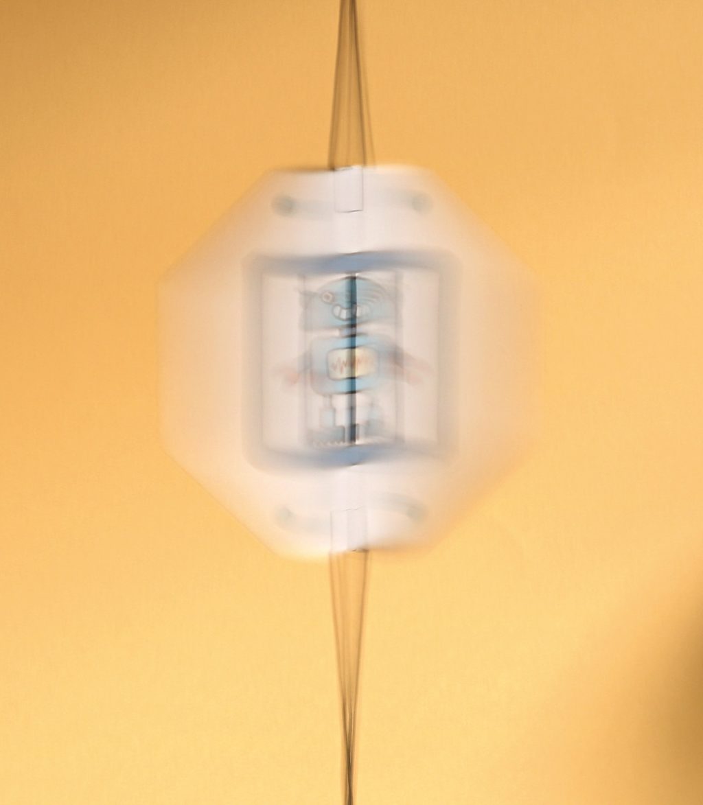 Durch die schnelle Drehung wechseln sich das Bild vom Roboter und das von der Kiste in rascher Folge ab. Wenn unser Gehirn die Bilder verarbeitet, die ihm unsere Augen senden, kann es aber nur ungefähr