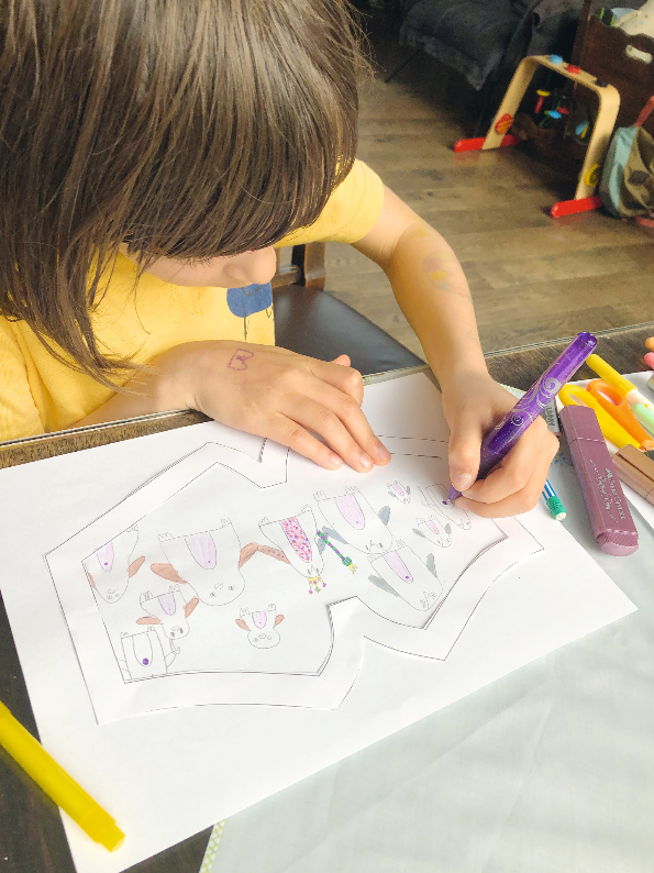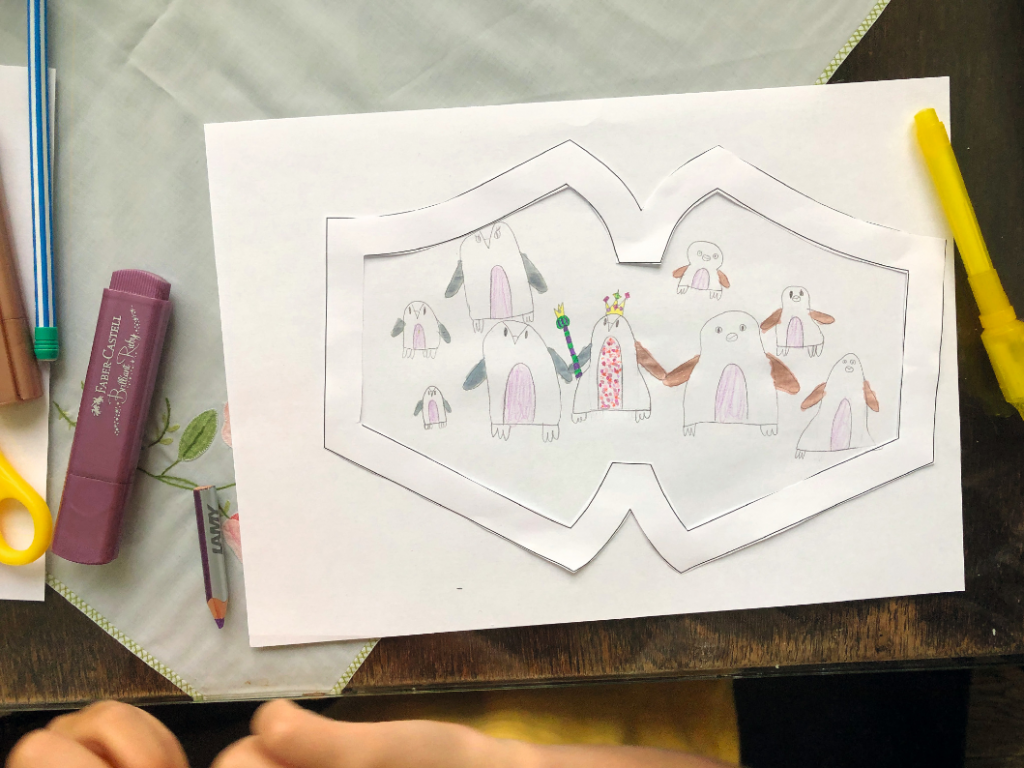 1. Kinder zeichnen auf die Maskenvorlage im Kinderheft der „familiii“-September-Ausgabe ihr Wunschdesign. (Auch hier findet ihr die Vorlage.)