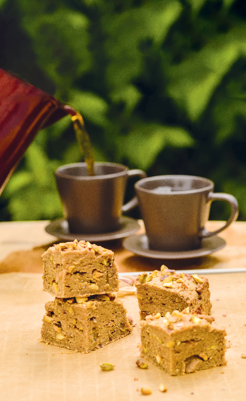 Das Backrohr auf 150 °C (Ober- und Unterhitze) vorheizen. Die Bananen schälen und mit den Datteln sowie der Erdnussbutter in der Küchenmaschine zu einer homogenen Creme vermengen. Darauf achten, dass die Datteln gut zerkleinert werden. Die Pistazien schälen, in ein Tuch oder ein Stück Küchenrolle einwickeln und mit einem Schnitzelklopfer oder Ähnlichem zerkleinern. Wer sich diesen Arbeitsschritt sparen möchte, kann auch einfach gehackte Pistazien kaufen. Eine Schicht von der Creme in eine kleine Auflaufform geben und Pistazienstücke darüber streuen. Die Auflaufform immer abwechseldn mit der Creme und den Pistazien befüllen. Die letzte Schicht Creme nochmals mit Pistazien bestreuen. Den Teig 15–20 Minuten backen. In kleine, eckige Stücke schneiden und servieren.
