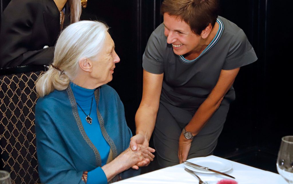 UN-Friedensbotschafterin und Schimpansenforscherin Dr.in Jane Goodall mit Mag.a Claudia Ertl-Huemer, Geschäftsfeldleiterin Education & Care Catering bei GOURMET