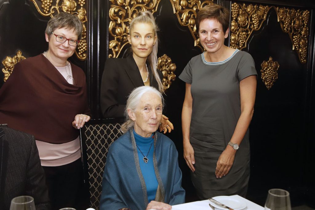 UN-Friedensbotschafterin und Schimpansenforscherin Dr.in Jane Goodall mit Mag.a Helga Cvitkovich-Steiner (Ltg. Marketing- u. Produktmanagement bie Education & Care Catering bei GOURMET), DI Carina Pirngruber (GF von NUSSYY®) und Mag.a Claudia Ertl-Huemer (Geschäftsfeldleiterin Education & Care Catering bei GOURMET)