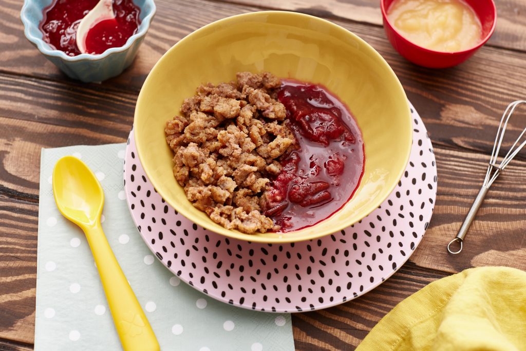 - Püriere die frischen Himbeeren zu einem Mus und zerbrösle die Milupa BIO Dinkelbiskotti.