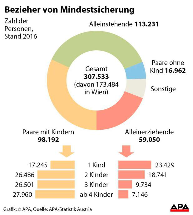 Die Daten der Statistik Austria zeigen, das 2016 mehr als die Hälfte der Bezieher von Mindestsicherung in Familien mit Kindern leben. Von den insgesamt 307.533 Beziehern in ganz Österreich lebten 98.192 in Paar-Haushalten mit Kindern, weitere 59.050 in Alleinerzieher-Haushalten mit Kindern, der Rest sind Alleinstehende oder Paare ohne Kinder.