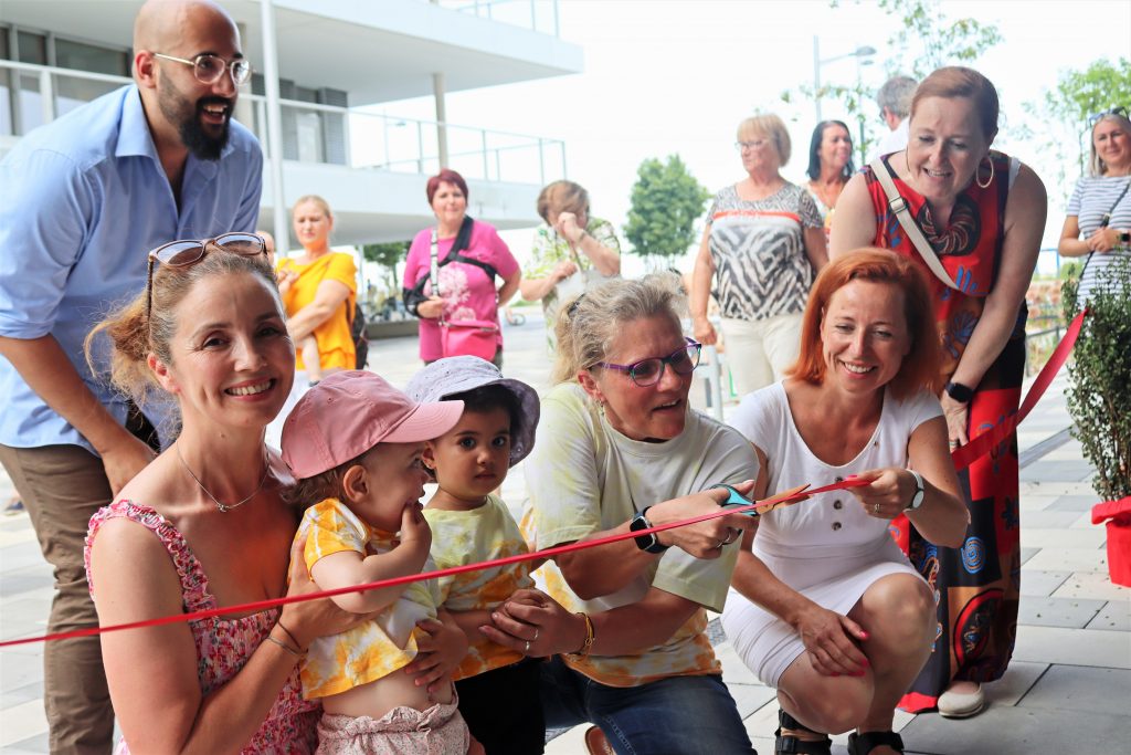 Bezirksvorsteher Ernst Nevrivy, Bundesrätin und Vorsitzende der Kinderfreunde Donaustadt Daniela Gruber-Pruner, Bezirksrätin Gabriele Plank, Gesiba-Prokurist Patrick Ritter, die beiden Geschäftsführer*innen der Wiener Kinderfreunde Daniel Bohmann und Alexandra Fischer und viele andere an der Projektplanung und Errichtung des Hauses beteiligte Personen feierten gemeinsam mit den Eltern, Kindern und dem Kindergartenteam.
