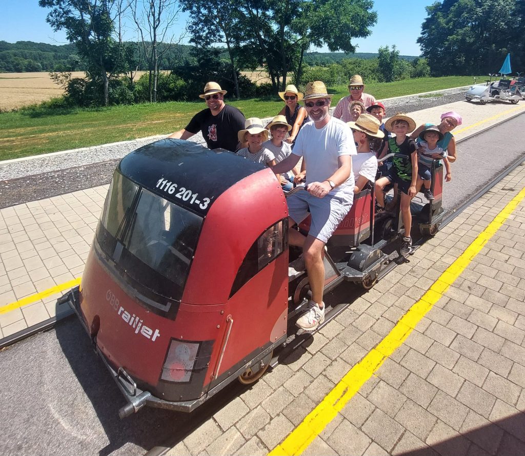 Heidi und Karl hatten ihre Kinder und alle ihre Enkelkinder dabei, als sie fest die Pedale ihrer Draisine traten, die sie von Horitschon nach Oberpullendorf im Mittelburgenland beförderte. Die alte Bahnstrecke ist 23 Kilometer lang, und man sollte sich mindestens zweieinhalb Stunden Zeit nehmen – besser länger -, um sie mit der Draisine zu bewältigen. „Beim Treten haben wir uns abgewechselt“, erzählt Karl. „Und wenn wir eine Pause machen wollten, haben wir die Draisine gemeinsam von den Schienen gehoben.“ Der Weg führt durch die idyllische Landschaft des Mittelburgenlandes, vorbei an Weingärten, Felder und Dörfern – und Gastronomiebetrieben. Bei Hunger hält man einfach an und stärkt sich. Denn ja: Kraft braucht man schon, um die Draisine in Bewegung zu bringen. „Aber zusammen geht das viel leichter.“