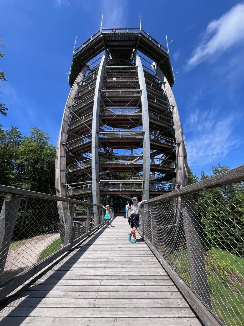 Der Salzkammergut Baumwipfelpfad hat Irmi, Martin und ihren Kindern Jakob, 10, und Charlotte, 8, richtig gut gefallen. „Vom Pfad hat man eine tolle Aussicht bis runter zum Traunsee“, sagt Irmi. Hoch oben über dem Waldboden zu spazieren, fanden die Kinder super, Highlight war für sie aber der 39 Meter hohe Aussichtsturm am Ende des Pfades. „Es geht dort wie in einer Spirale hinauf und die Kinder waren jedes Mal begeistert, wenn es noch eines, noch eines und dann noch ein Stockwerk weiterging.“ Oben angekommen hat man eine 360 Grad-Panorama-Aussicht und muss sich entscheiden: Entweder man nimmt die Rampe, um wieder runter zu kommen. Oder die 75 Meter lange Tunnelrutsche.
