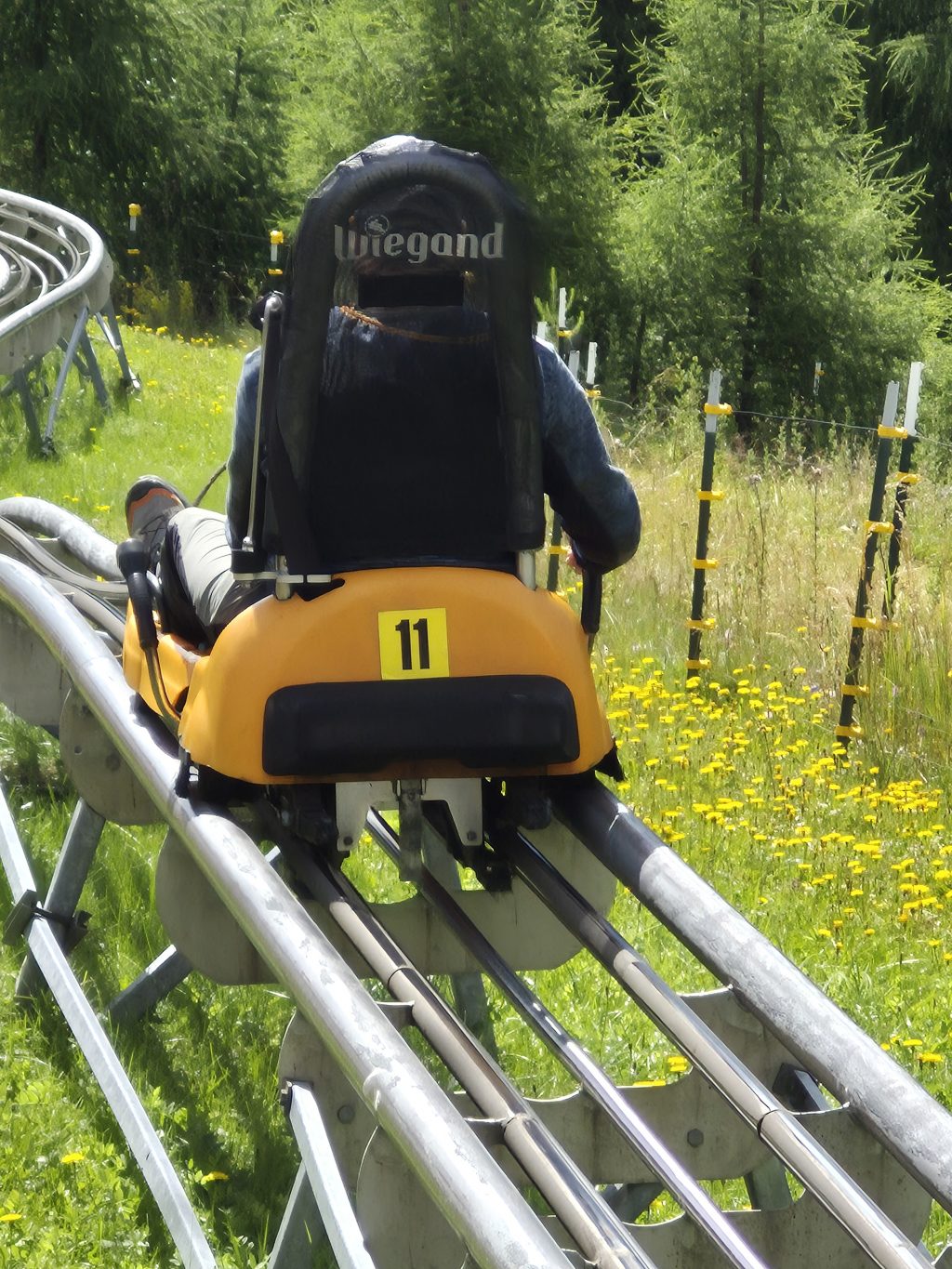 Das Highlight ist der Alpine Coaster, die über 3,5 Kilometer lange ‚Alpenachterbahn‘. Deren höchste Stelle ist 10 Meter über dem Boden. Wer sich traut, darf damit runter sausen – und Opa und Oma winken von der Seitenlinie zu. Im Alpine Coaster dürfen Kinder ab drei Jahren in Begleitung eines Erwachsenen, ab acht und einer Körpergröße von 1,25 darf man alleine fahren.