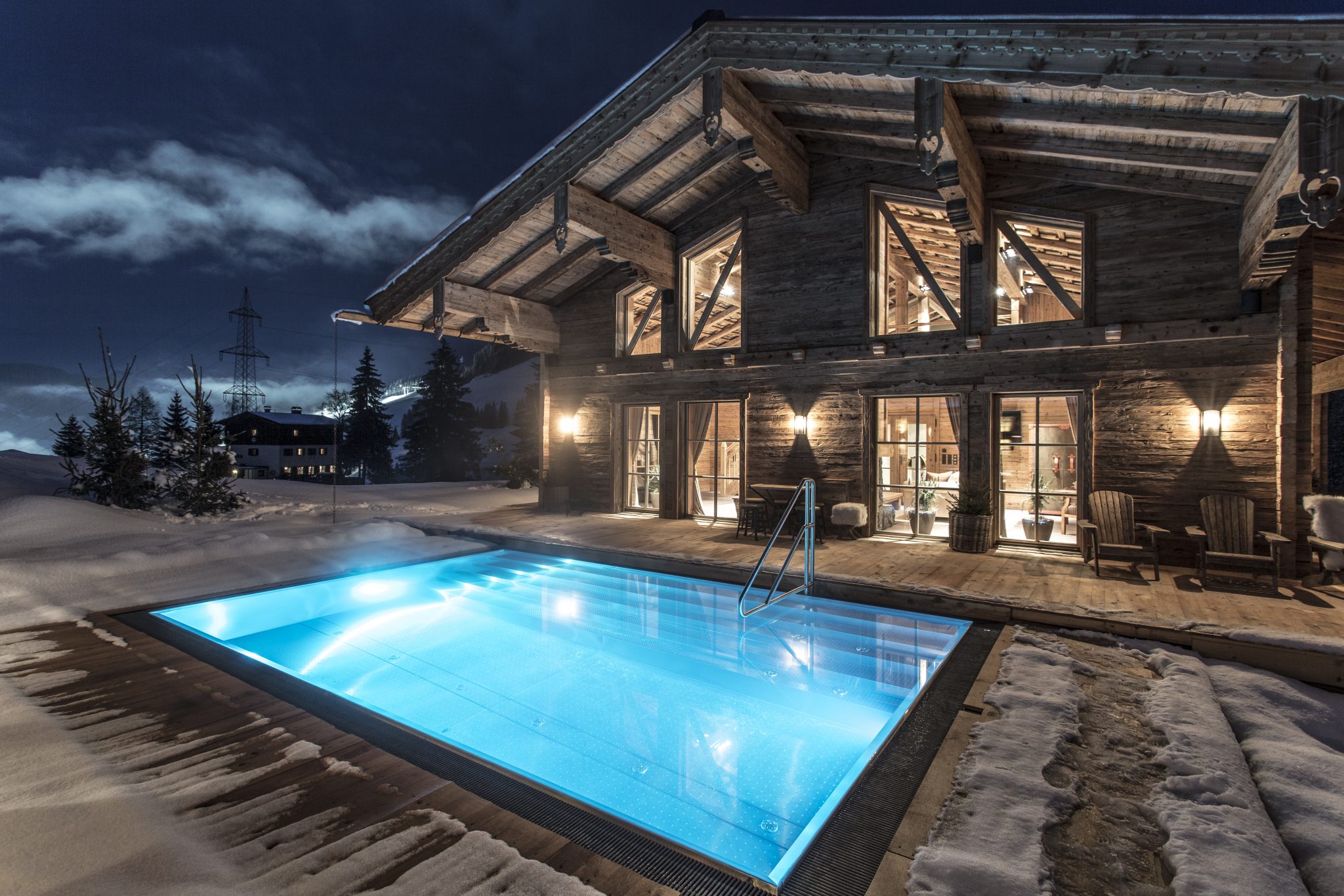Zum Abschluss eines erlebnisreichen Tages können Gäste in ihrer persönlichen Wellnessoase, einem eigenen Alpenspa mit Sauna und Swimmingpool, die Seele baumeln lassen und wohltuende Massagen und Beautybehandlungen direkt im Chalet genießen. Auf Wunsch verwöhnt ein Privatkoch gourmetaffine Gäste in der vollausgestatteten Designküche und kreiert alpine Gaumengenüsse mit Kräutern aus dem eigenen Chaletgarten.