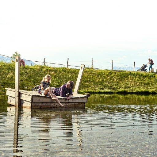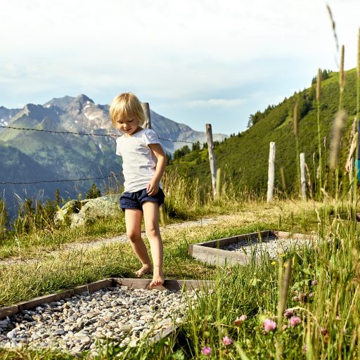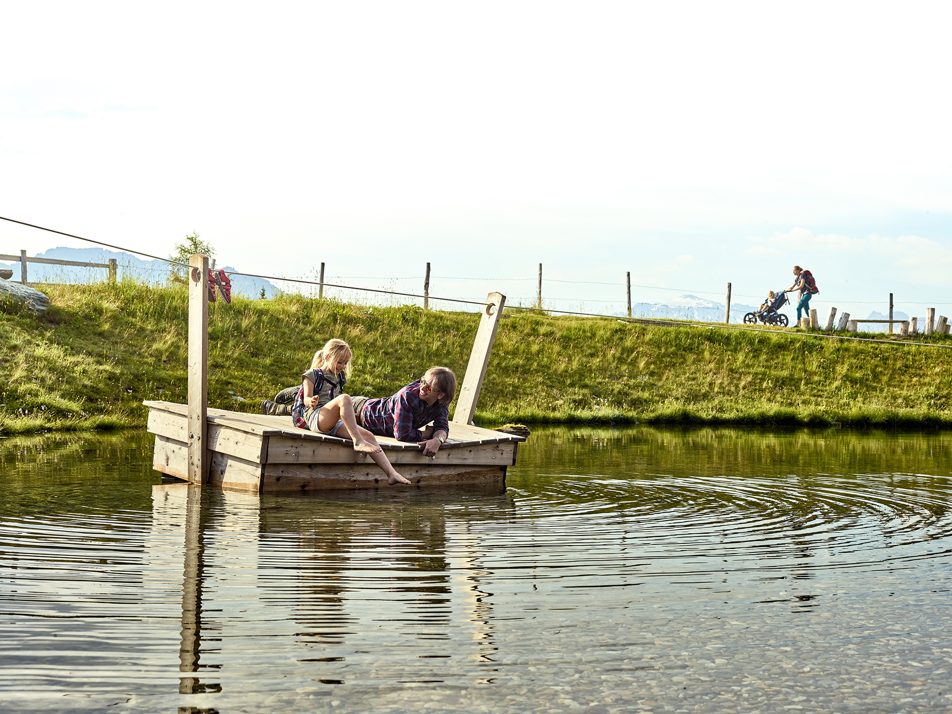 Als Oase am Berg gilt der Speicherteich Hochalm. Am Ufer regt der beliebte Barfußweg zu einer Entdeckungstour an, die den Fuß-Spürsinn weckt. Besonders prickelnd: der Teich selbst ist Teil des 40 Meter langen Barfußweges und macht die Kraft des Wassers hautnah spürbar. Ganz in ihrem Element sind die Besucher auch auf einem Floß im seichten Wasser. Der neue Wasserspielplatz an der Bergstation der Hochalmbahn garantiert erfrischenden Spaß für Groß und Klein und animiert zum sinn-vollen Spiel. Und das alles mit herrlichem Rundblick auf die Goldberggruppe, Großglockner, Niedere Tauern, Steinernes Meer, Hochkönig und Dachstein.